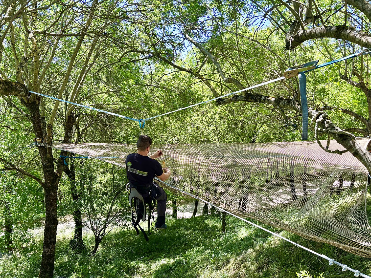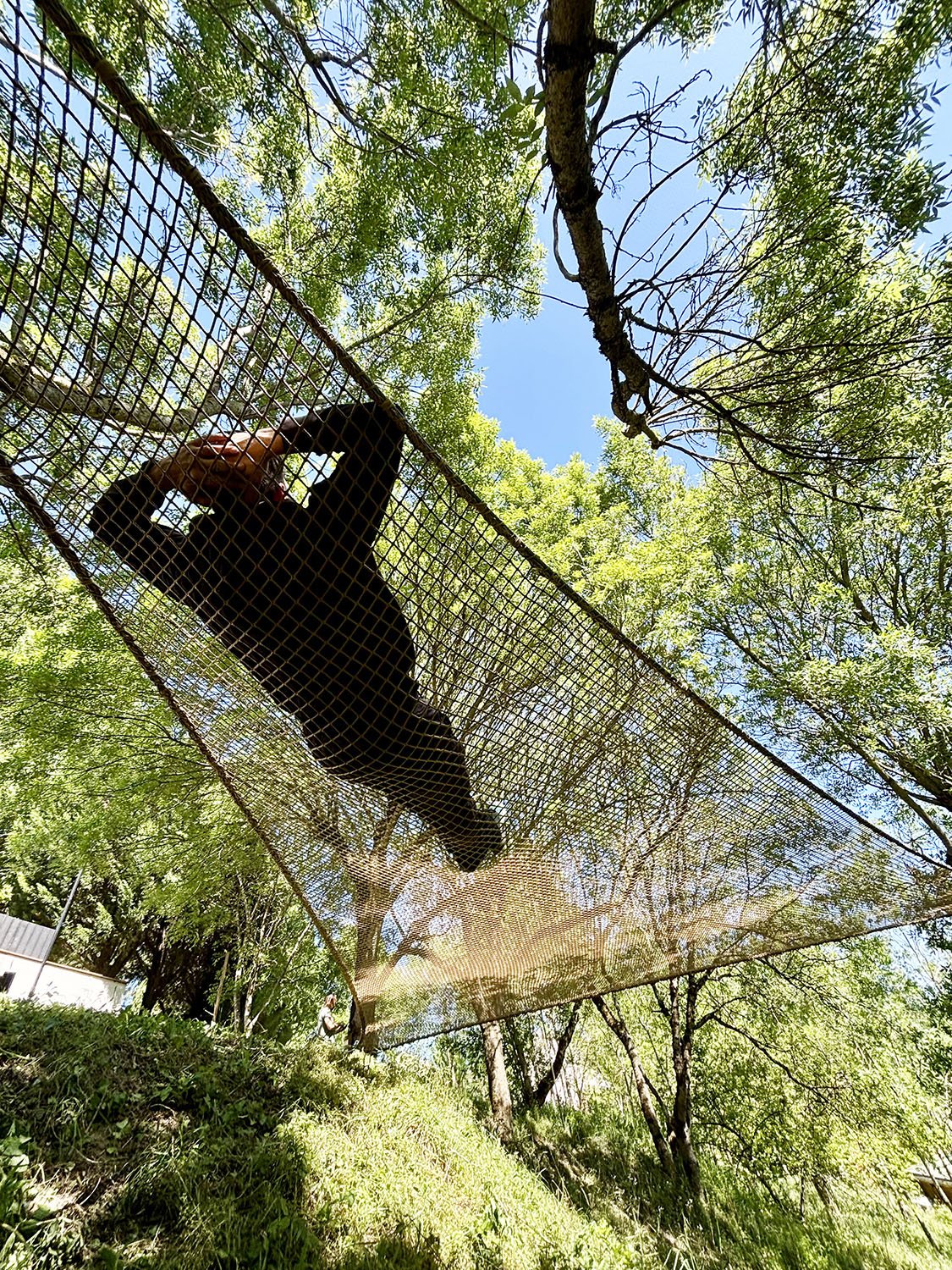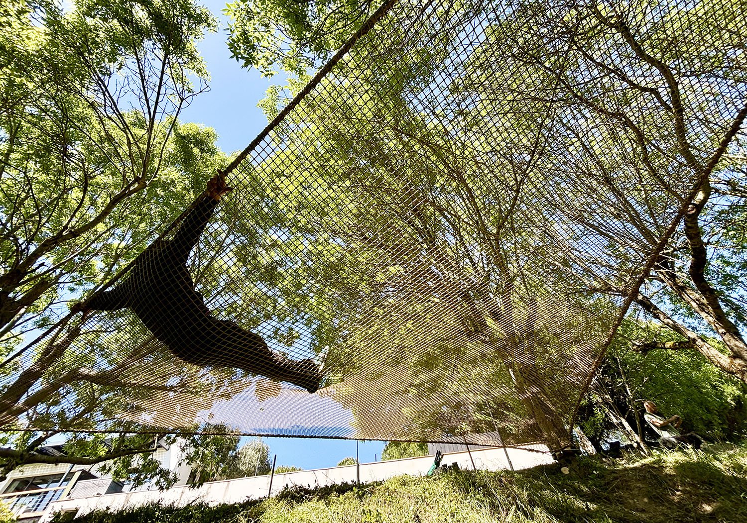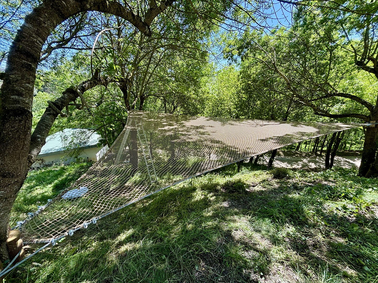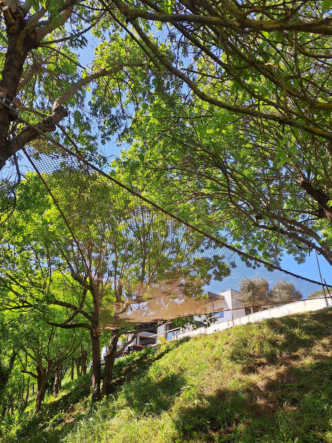 Le filet beige se fond parfaitement avec l’ambiance nature du site, ajoutant un équipement atypique et unique qui sublime l’ensemble de la propriété.
